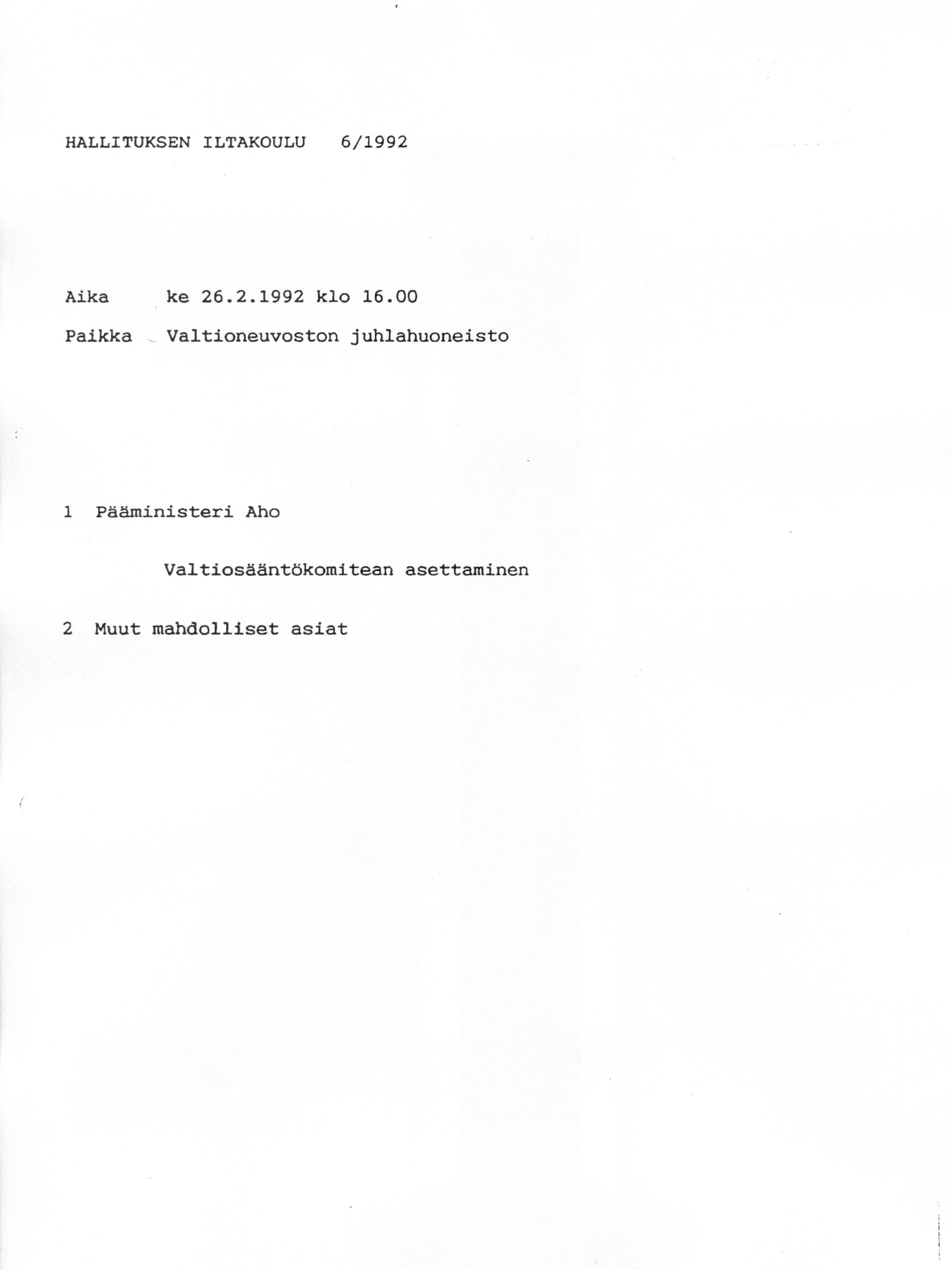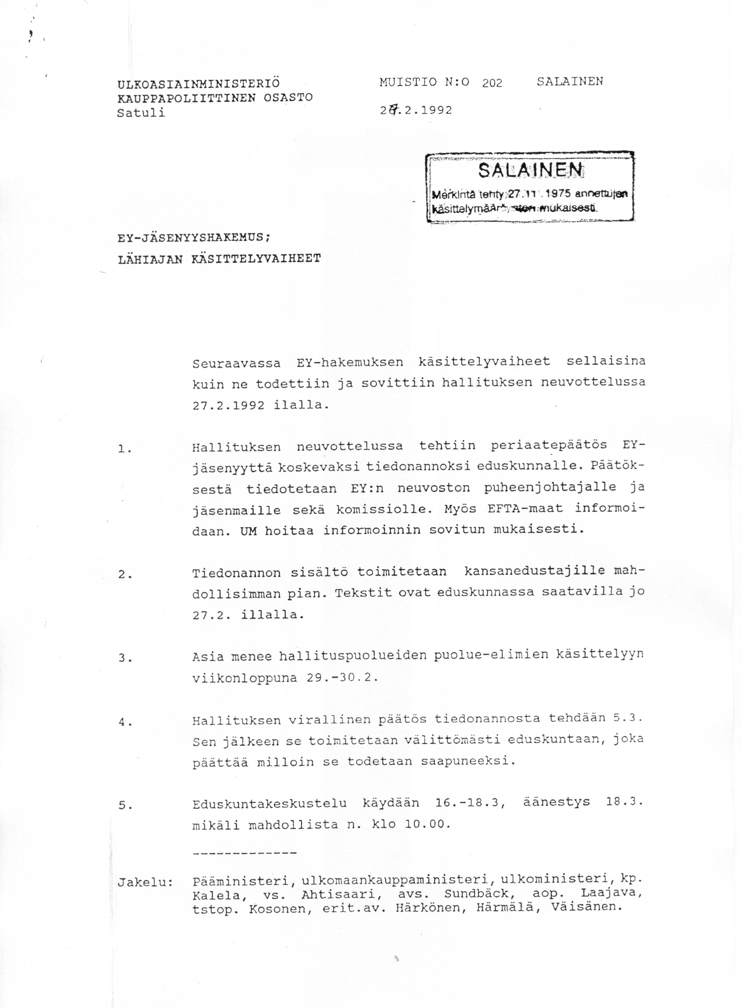 Suomen hallitus oli torstaina 27.2.1992 pitänyt iltakoulun kokouksen, joka koski EY-jäsenyyden pikaista hakemista. Kokouksen pöytäkirja määrättiin osittain salaiseksi ja kokouksessa käsitelty Ulkoministeriön muistio määrättiin salaiseksi.