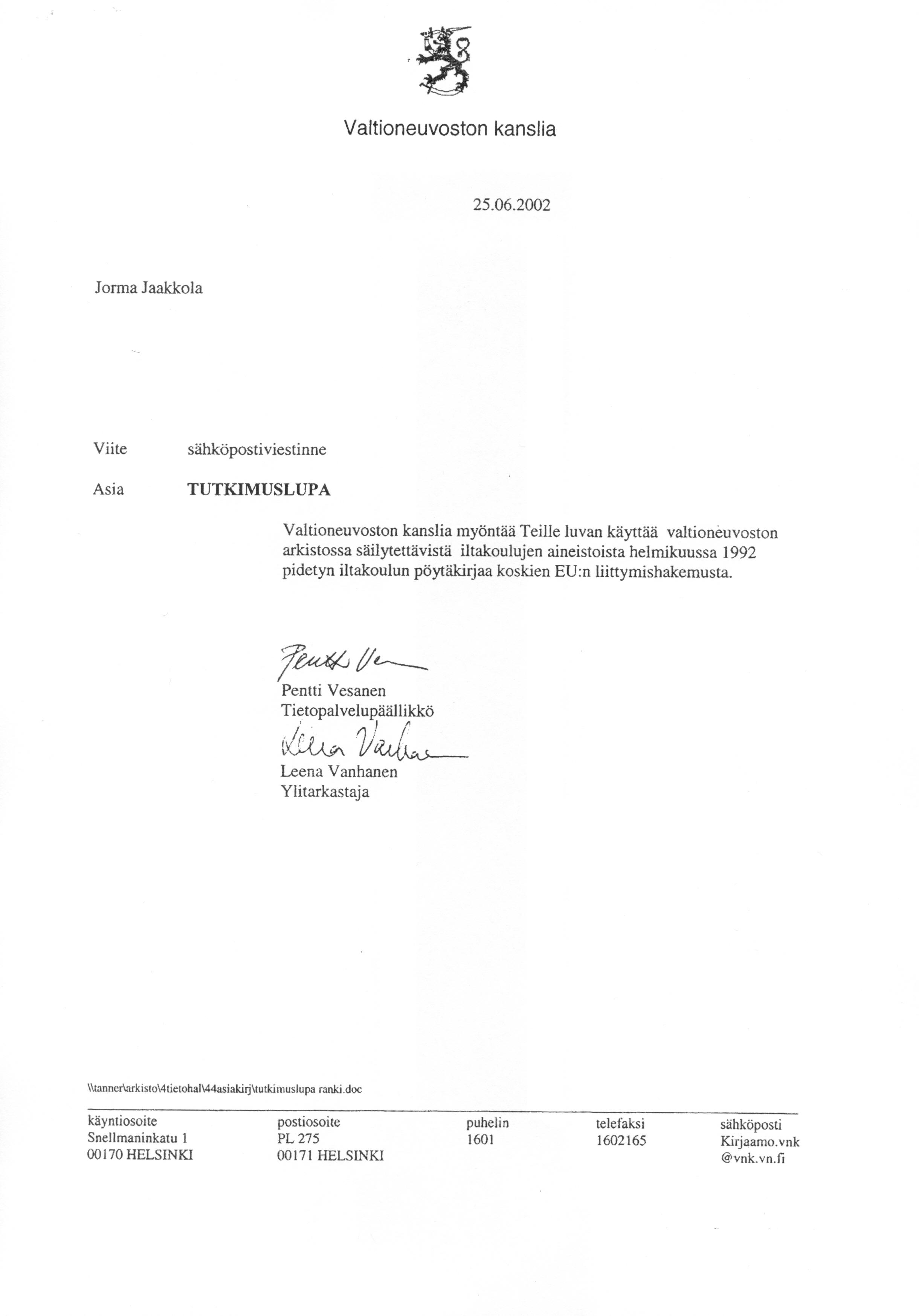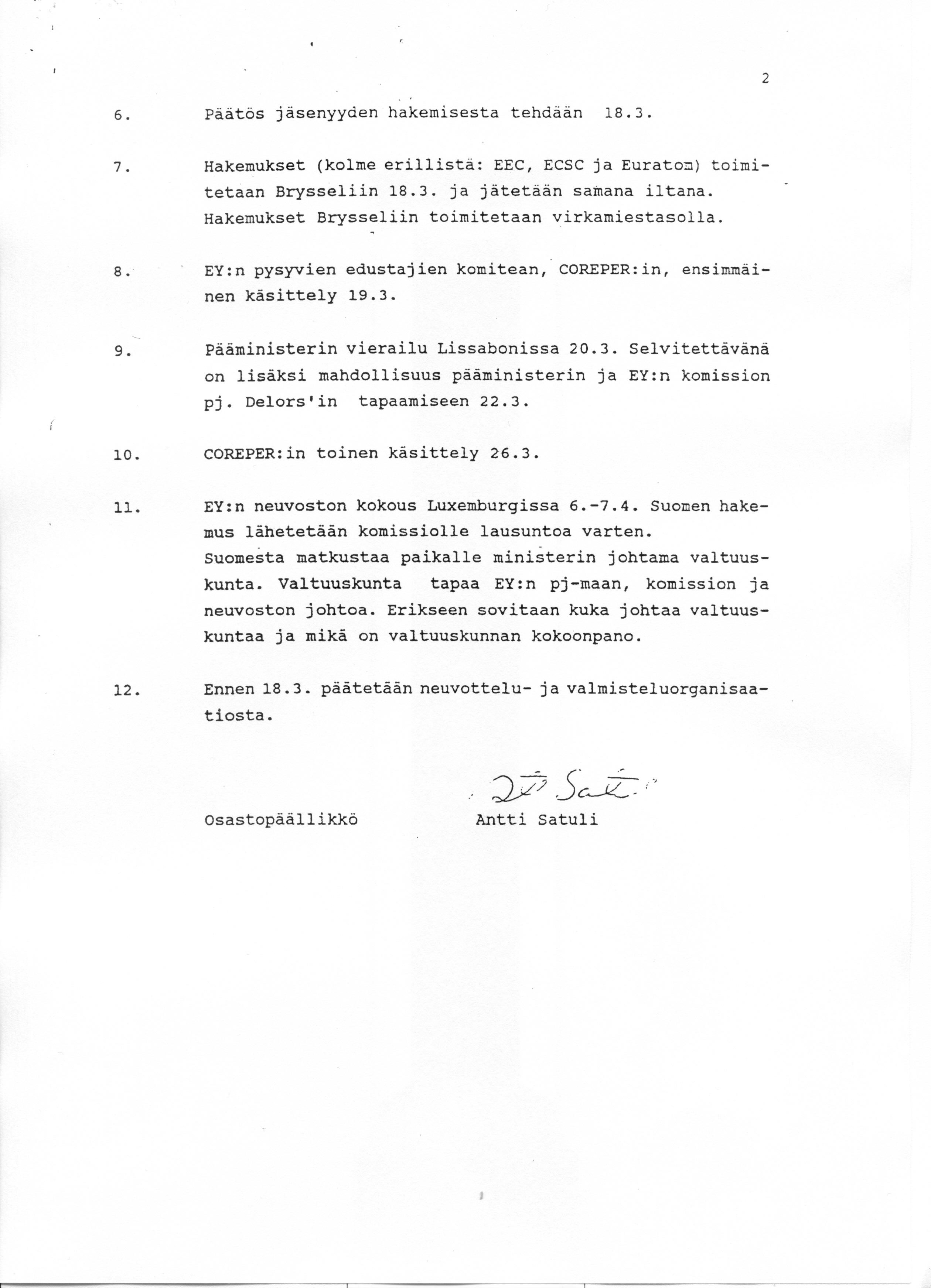 Yksi päiväys - 27.2.1992 - Ulkoministeriön Eurooppa-tiedotuksen kirjastoissa jakamassa EY-materiaalissa käynnisti tutkimukseni Suomen EY-jäsenyyshakemuksesta. Dokumenttiaineisto, joka jäsenyyden hakemiseen liittyy on massiivinen, joten tässä selvityksessäni on lukijalla paljon sisäistämistä.